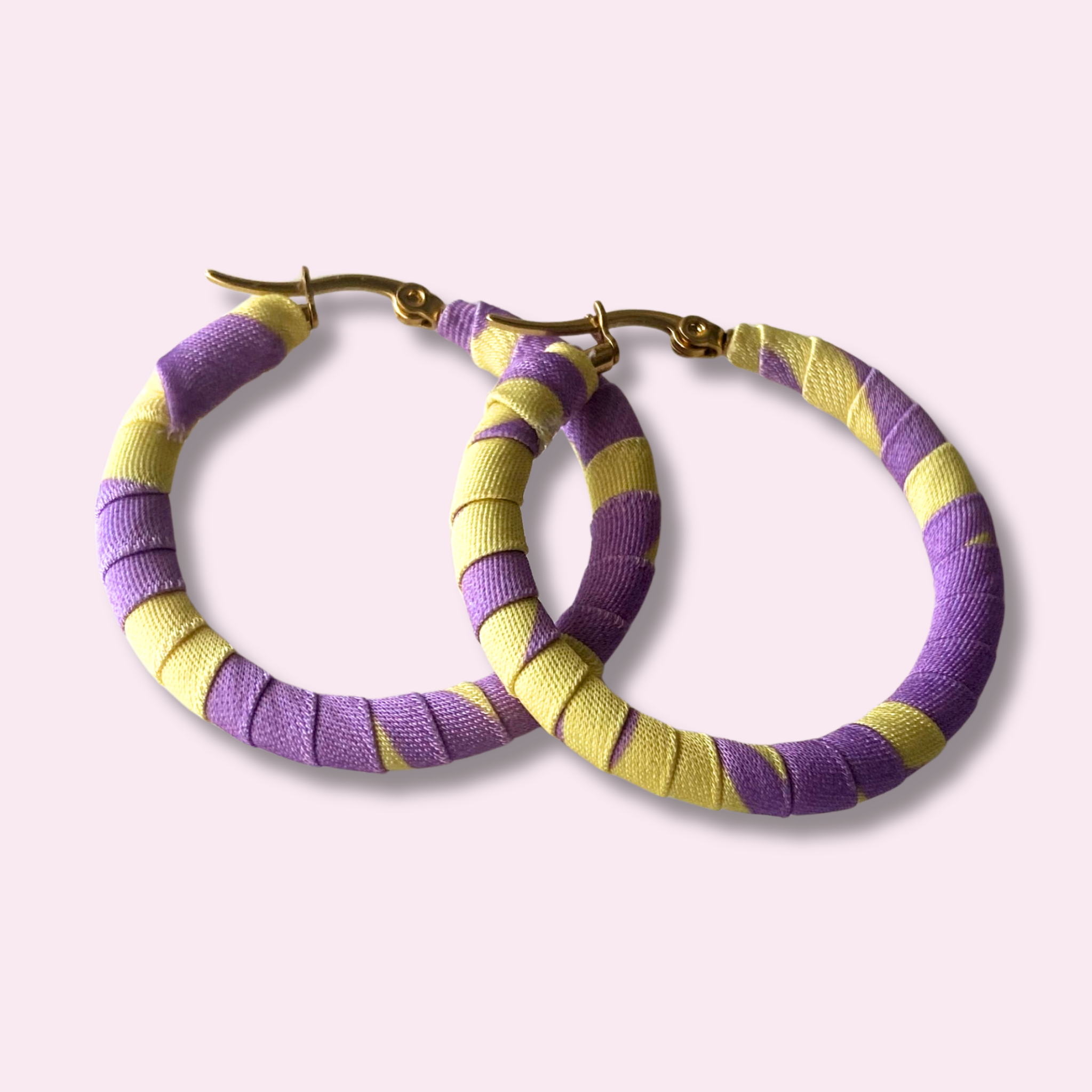 Delicate yet full of charm, our Large Medellín Wrapped Hoops feature light yellow and violet fabrics inspired by Medellín’s floral beauty and vibrant culture. Handmade and lightweight, these 40 mm earrings add a soft yet playful touch to your summer wardrobe.